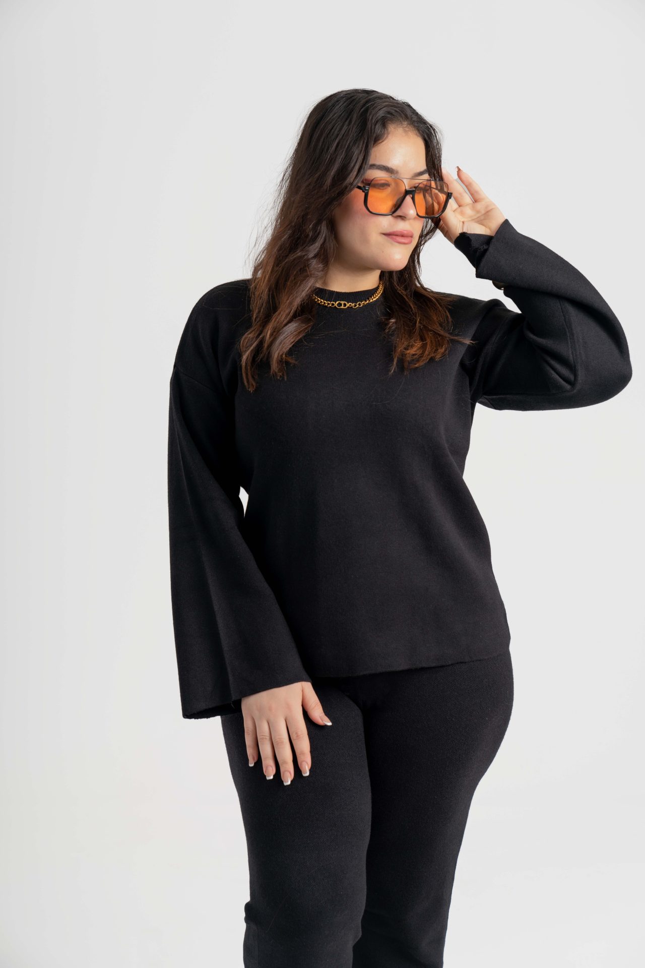 التصميم: بلوفر تريكو بقصة بسيطة وبنطلون بقصة مريحة وانيقة